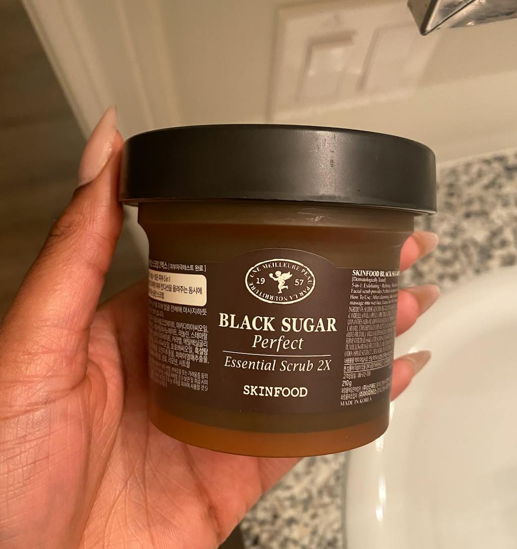 SKINFOOD Perfect Essential Scrub is an exfoliating mask & scrub containing black sugar, rice wine, and fruit extracts that gently exfoliates skin for a brighter and smoother complexion.